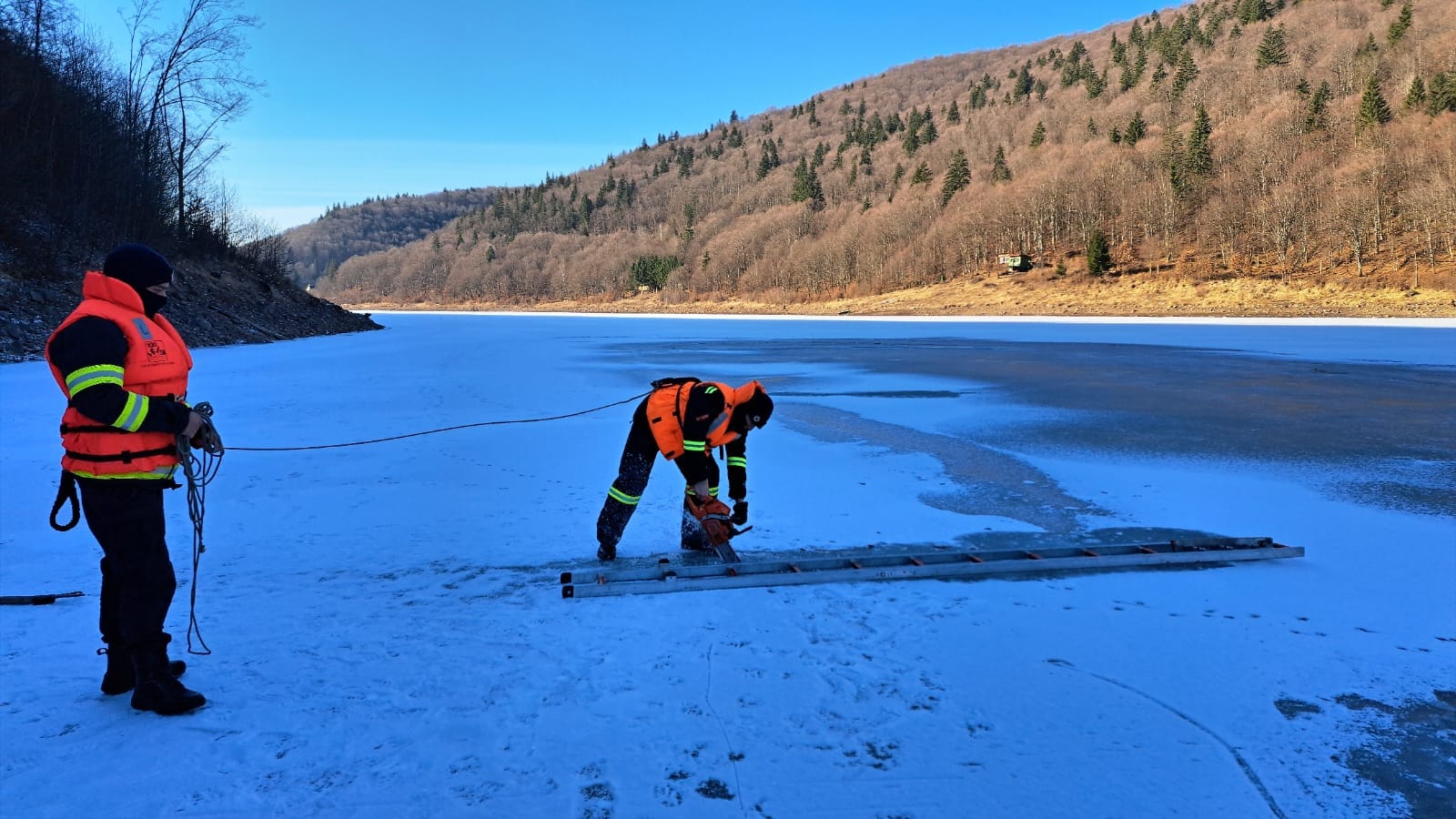 Salvatorii au spart stratul de gheață de la suprafața lacului și au efectuat căutări cu cangea, însă până la ora 19:30 nu au reușit să găsească persoana.