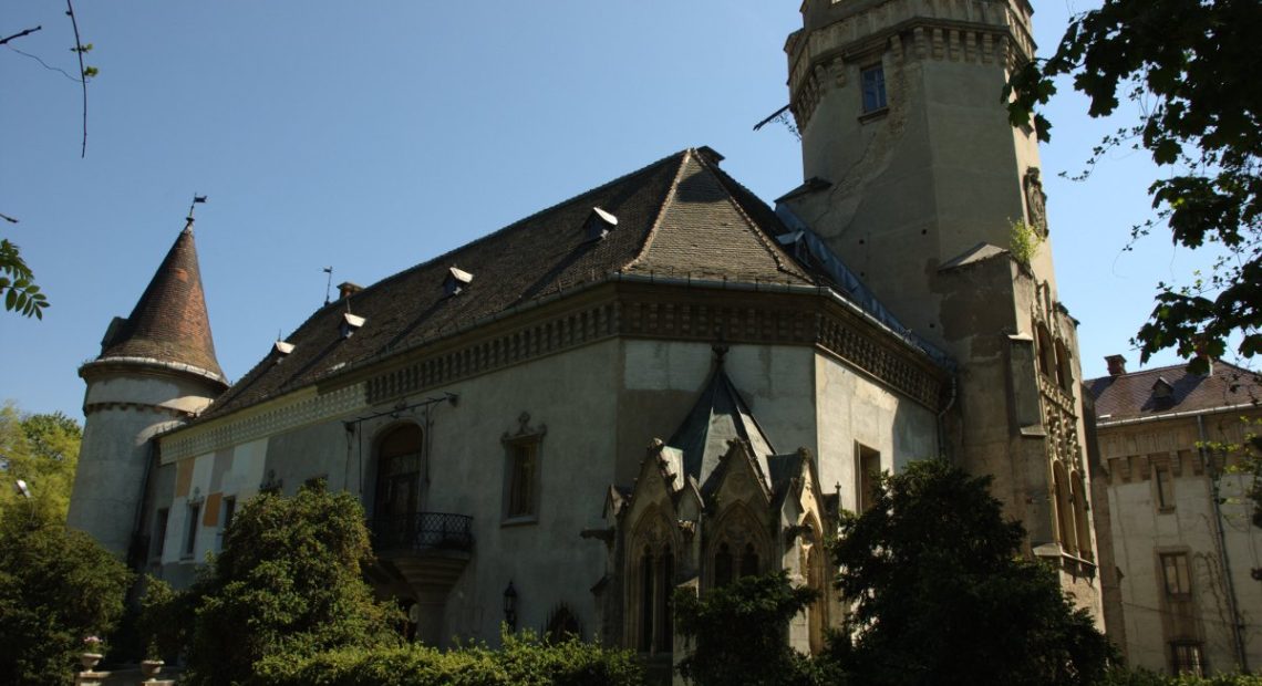 Arhitectura neogotică romantică cu turnuri, creneluri și detalii inspirate din stilurile medievale europene.