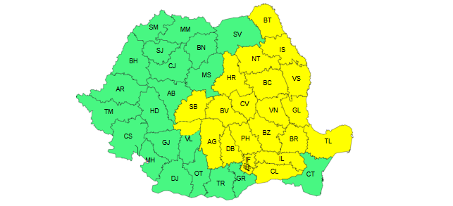 Administrația Națională de Meteorologie a emis un cod galben de vreme rea pentru mai multe județe din țară, inclusiv Covasna. Acesta va fi valabil în perioada 22 iulie, ora 12:00 – 23 iulie, ora 03:00.
