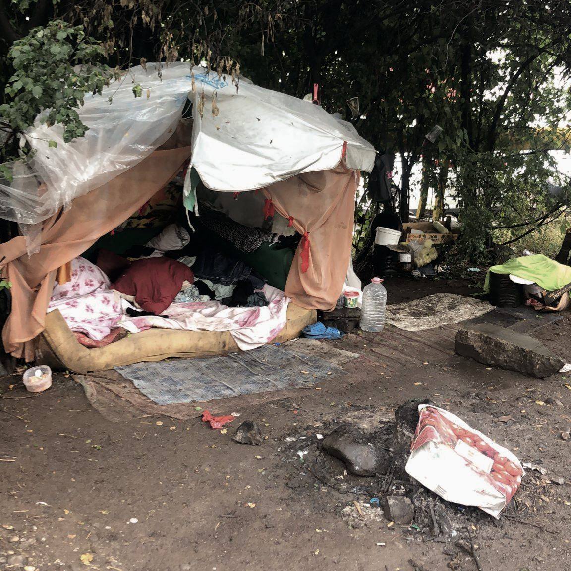 Deși au locuințe, au ales să se mute în cortul improvizat ca să fie aproape de locurile unde cerșesc zilnic și strâng sticle și PET-uri, pe care le duc apoi la centrele de colectare pentru câțiva lei.