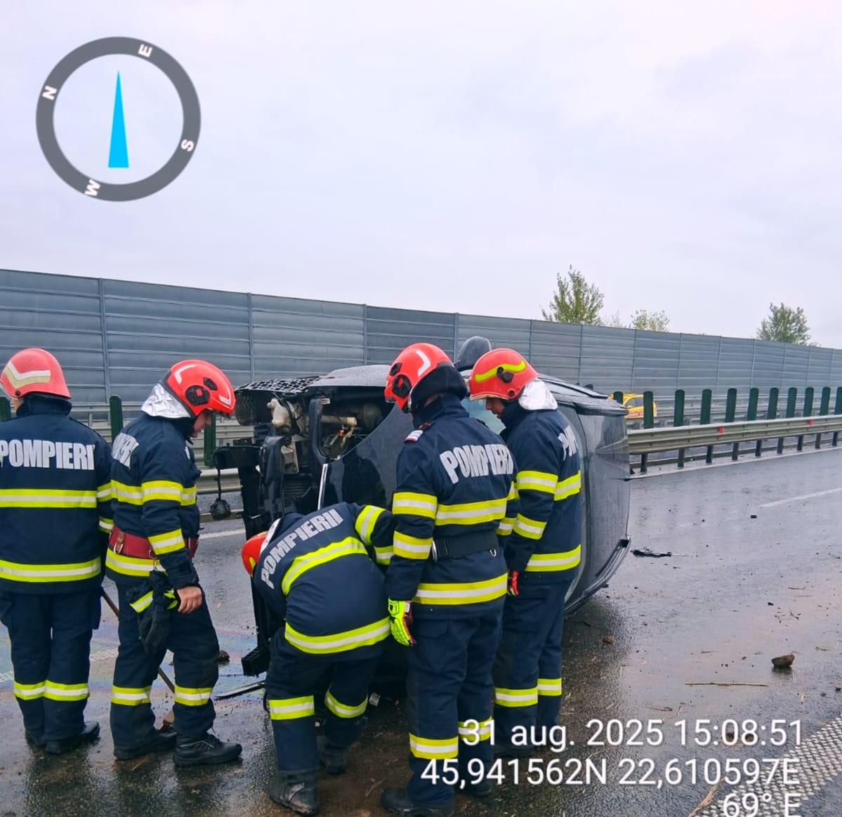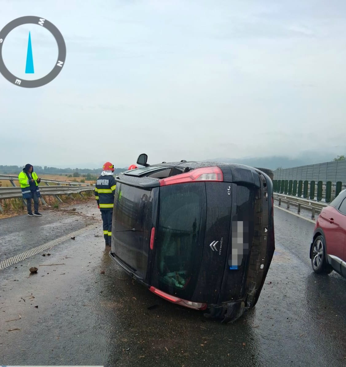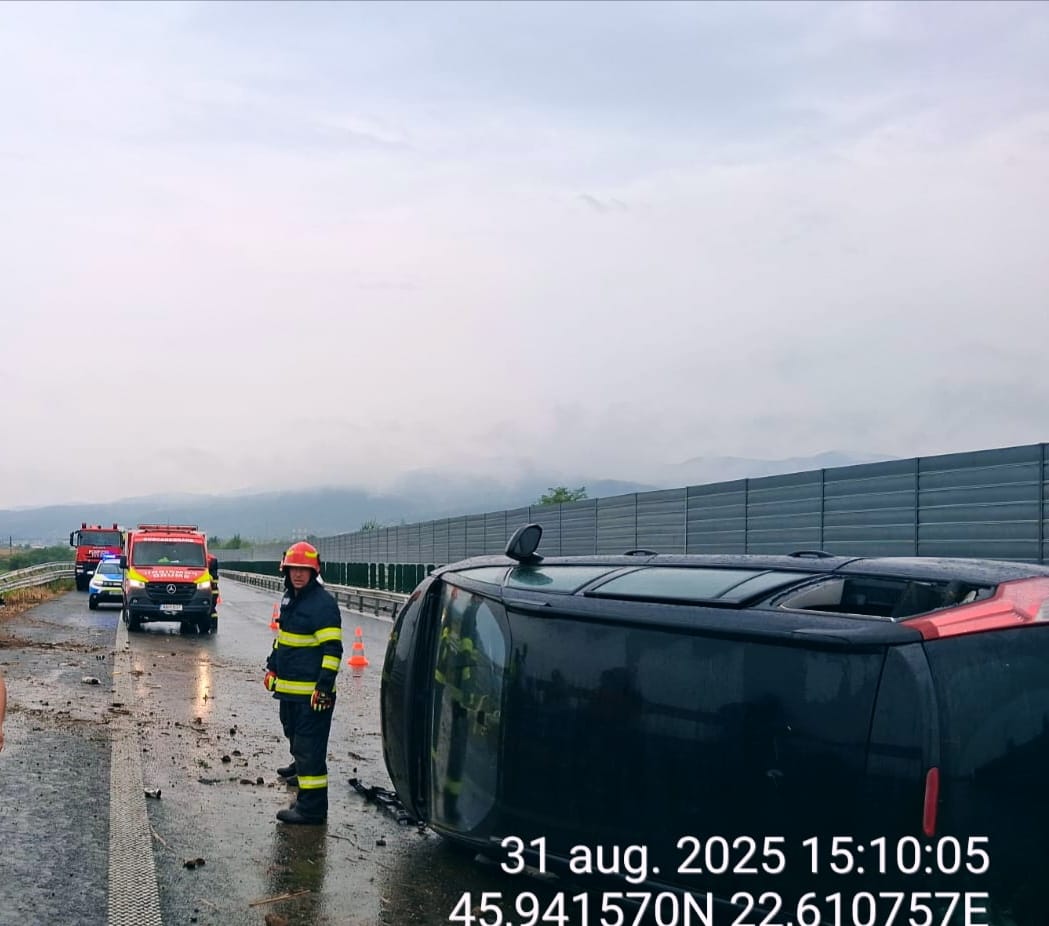 Accident pe autostradă, pe sensul Arad – Sebeș. O mașină s-a dat peste cap – FOTO