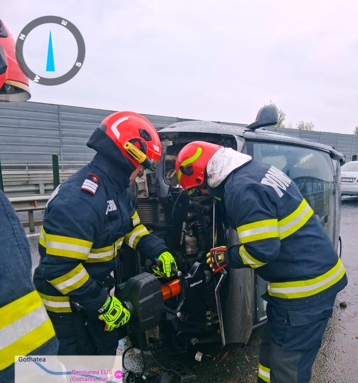 Pompierii ajunși la locul intervenției au constatat faptul că, în accident au fost implicate două autoturisme, unul dintre acestea fiind găsit răsturnat.