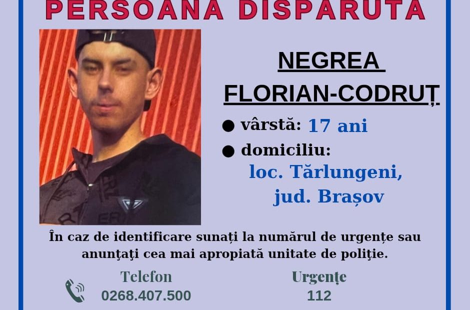 Polițiștii din Brașov caută cu disperare un tânăr de 17 ani, Negrea Florian-Codruț, care a dispărut fără urmă pe 29 septembrie din localitatea Tărlungeni.