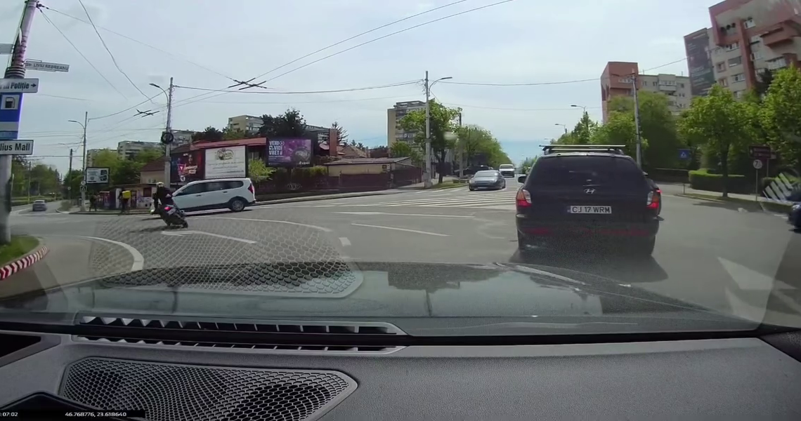 Un motociclist și-a riscat viața în Cluj-Napoca și a ajuns sub o mașină – Accident filmat